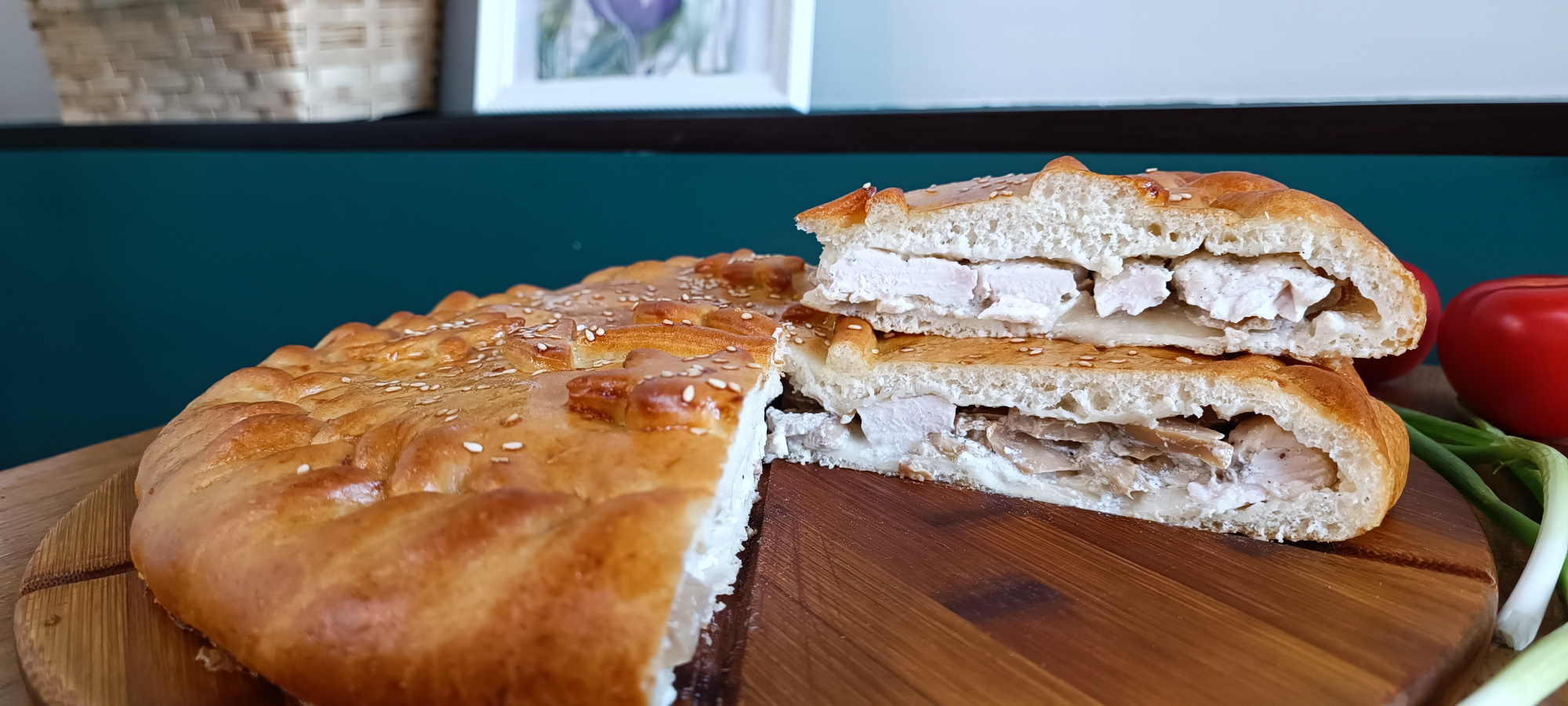 Состав: Тесто дрожжевое, филе куриное, шампиньоны, лук репчатый.