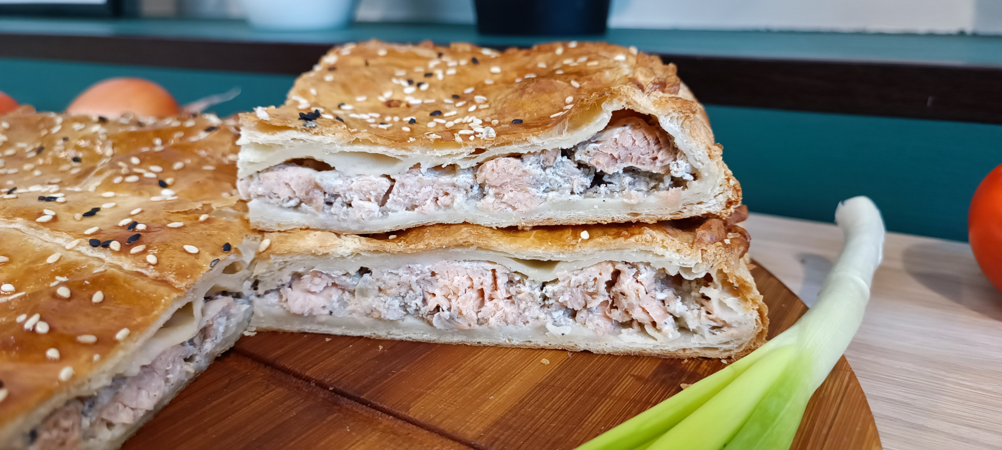 Состав: Тесто слоеное, филе горбуши, лук репчатый.