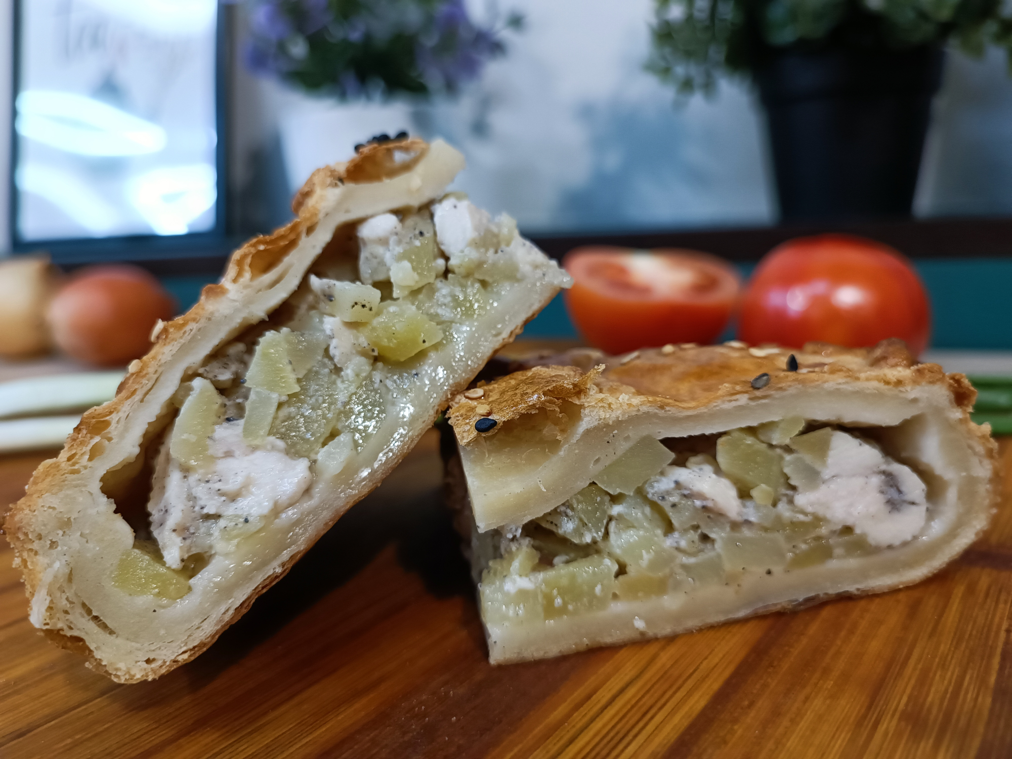 Состав: Тесто слоеное, филе куриное, картофель, сыр голанский, лук репчатый.